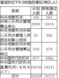 据统计,从上午8时开始到下午5时,9个小时内,报名系统已通过审核19372人,比去年同期增长6248人,去年首日只有13000多人。其中,4031个职位已有考生通过审核,占总职位数的30%左右。