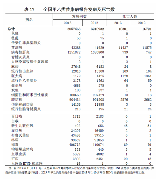 (一)传染病报告发病和死亡。2013年,全国甲乙类传染病共报告发病305.75万例,死亡16301人。报告发病数居前5位的病种依次为病毒性肝炎、肺结核、梅毒、细菌性阿米巴性痢疾、淋病,占甲乙类传染病报告发病总数的93.26%;报告死亡数居前五位的病种依次为艾滋病、肺结核、狂犬病、病毒性肝炎、流行性出血热,占甲乙类传染病报告死亡总数的98.09%(见表17)。