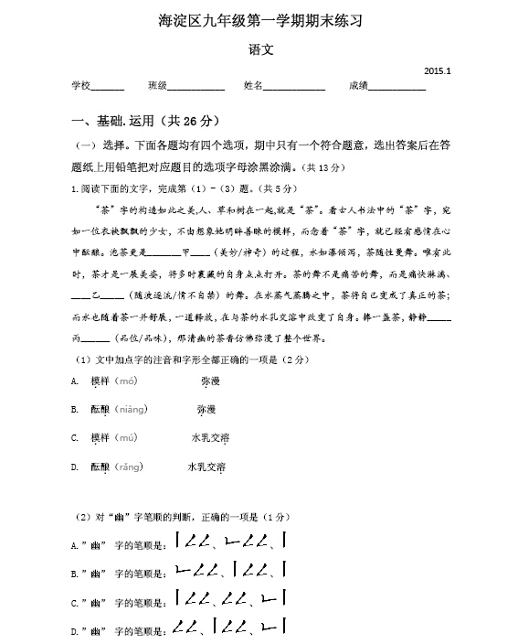 2014-2015海淀区初三上学期语文期末考试试题及答案