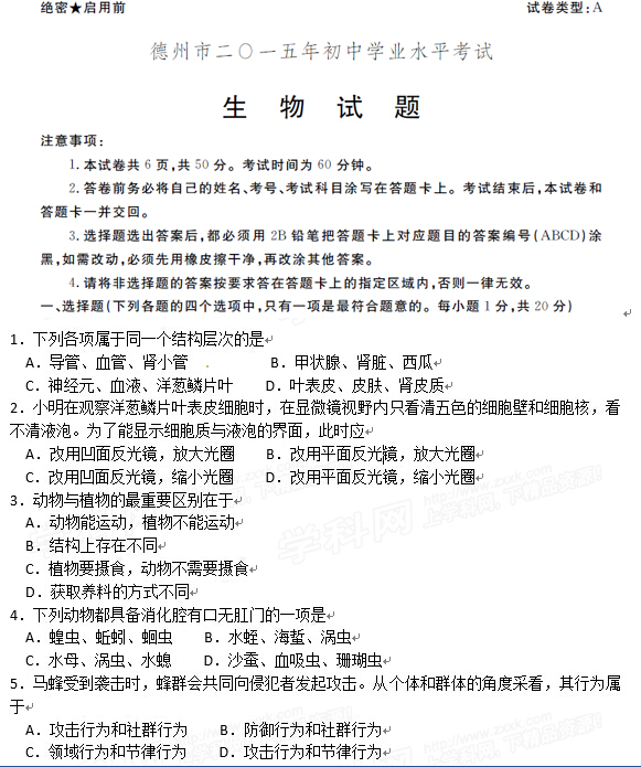 2015年山东德州中考生物考试已经结束,新东方在线中考网第一时间整理了2015山东德州中考生物试卷及答案,供同学们参考。更多2015中考最新资讯、2015中考录取分数、2015中考体育等相关资讯将不断更新,敬请关注。