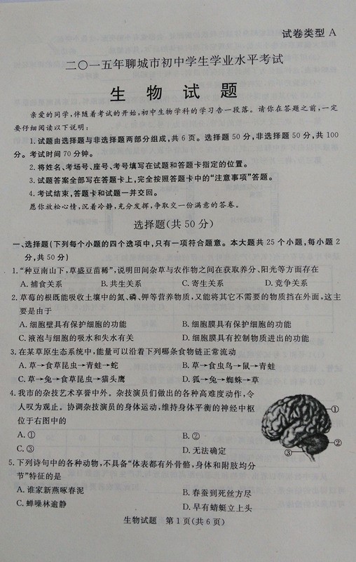2015年山东聊城中考生物考试已经结束,新东方在线中考网第一时间整理了2015山东聊城中考生物试卷及答案,供同学们参考。更多2015中考最新资讯、2015中考录取分数、2015中考体育等相关资讯将不断更新,敬请关注。