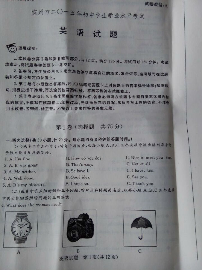 2015年山东滨州中考英语考试已经结束,新东方在线中考网第一时间整理了2015山东滨州中考英语试卷及答案,供同学们参考。更多2015中考最新资讯、2015中考录取分数、2015中考体育等相关资讯将不断更新,敬请关注。