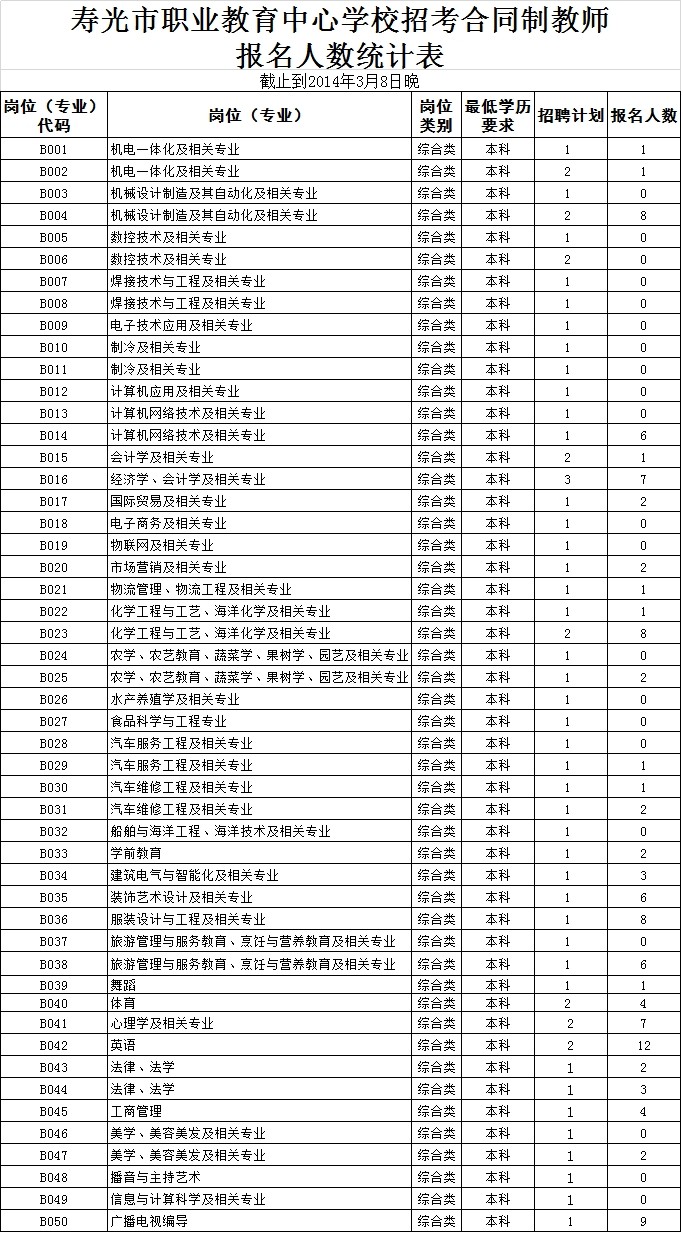 2014年潍坊寿光职教中心招聘报名情况(截至2014年3月8日晚)