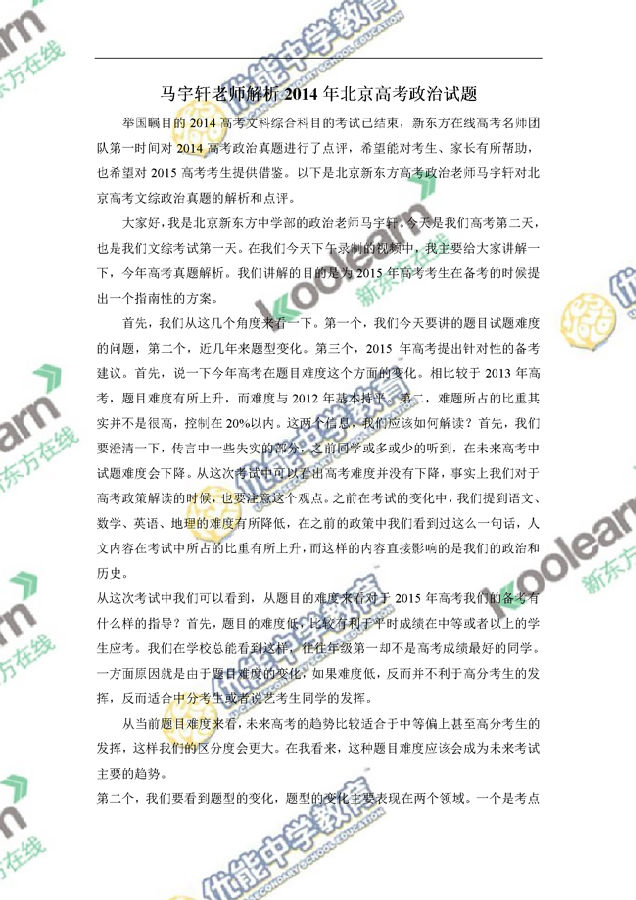2014年北京高考文科综合考试已结束,新东方在线高考网邀请新东方优能中学名师马宇轩为大家第一时间点评2014年北京高考政治试题,更多2014高考试题及答案,请查看2014年高考试题及答案专题!