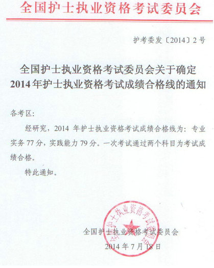 全国护士执业资格考试委员会关于确定2014年护士执业资格考试分数线的通知