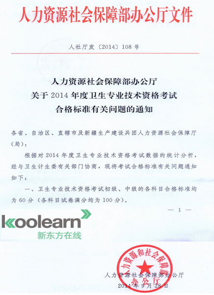国家人力资源社会保障部办公厅关于2014年卫生专业技术资格考试合格标准分数线有关问题的通知: