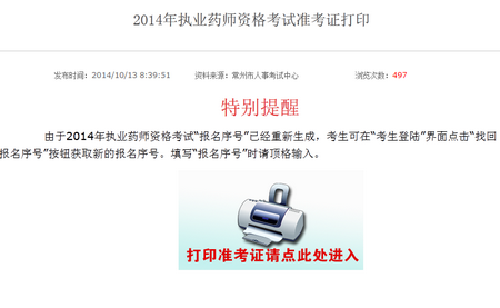 常州人事考试中心网2014年执业药师准考证打印入口开通,新东方在线医学教育网为考生开通2014年常州执业药师准考证打印快速官方入口,考生可点击下面网址或图片直接进入常州2014年执业药师准考证打印入口进行打印准考证。