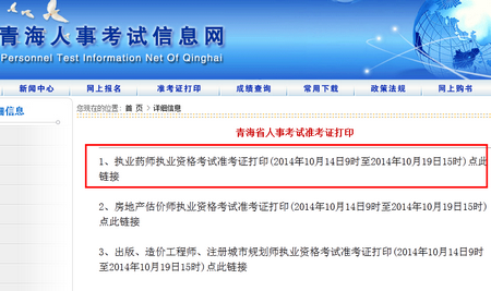 青海人事考试信息网2014年执业药师准考证打印入口:http://www.qhpta.com/html/17/Content98.html
