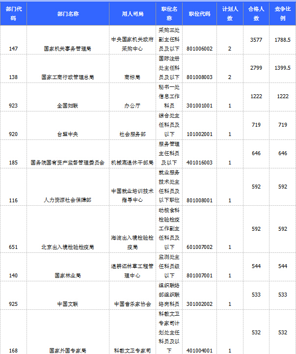 报名通过审核人数前十的职位主要集中在国家工商行政管理总局、国家机关事务管理局、商务部、共青团中央等部门,具体信息如下: