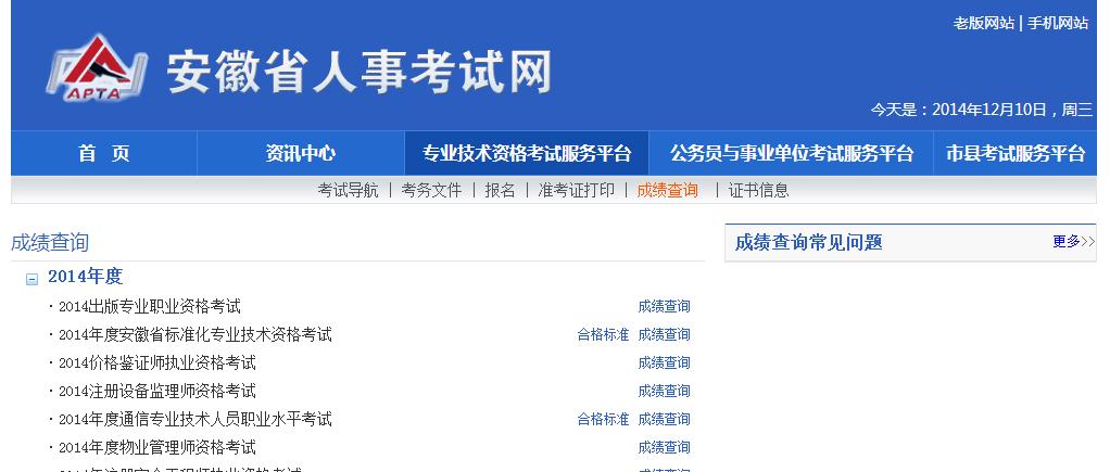 安徽人事考试网2014年执业药师成绩查询入口:安徽执业药师考试成绩查询官方网站为安徽人事考试网(http://www.apta.gov.cn/),安徽人事考试网2014年执业药师成绩查询入口已于2014年12月26日开通,新东方在线医学网第一时间为考生开通安徽2014年执业药师成绩查询快速官方入口,方便考生查询。