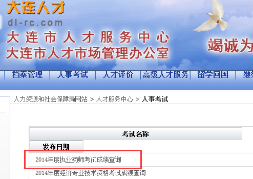 大连2014年执业药师成绩查询入口:http://www.dl12333.gov.cn/rcfwzx/rsks/Pages/C6I061.aspx
