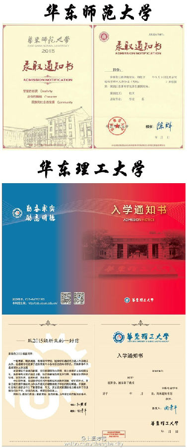 2015年高考招录工作火热进行中,各高校的第一批录取通知书正陆续寄出,被录取的考生或许早翘首以盼、按耐不住了。上海政府新闻办官微收录了14所沪高校的录取通知书,亮闪闪各具特色,让我们一睹为快吧。