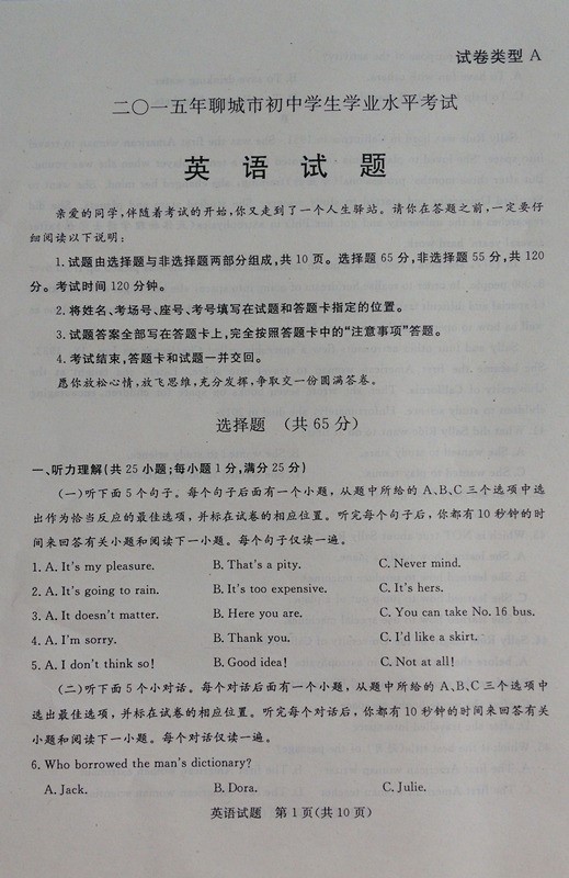 2015山东聊城中考英语试卷及答案