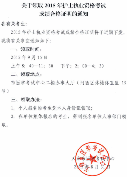 天津2015年护士资格考试成绩合格证明领取