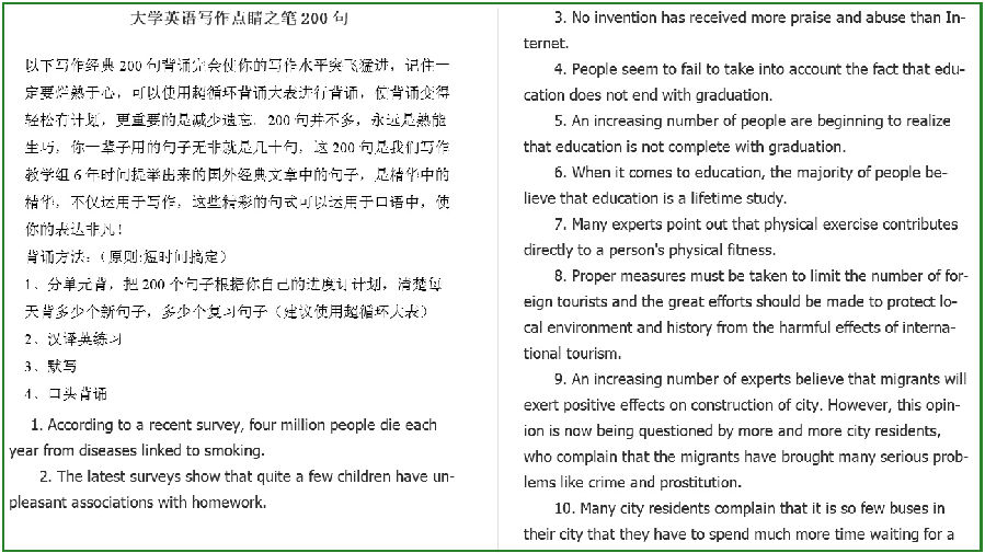 200句并不多,永远是熟能生巧,你一辈子用的句子无非就是几十句,这200句是我们写作教学组6年时间提举出来的国外经典文章中的句子,是精华中的精华,不仅运用于写作,这些精彩的句式可以运用于口语中,使你的表达非凡!