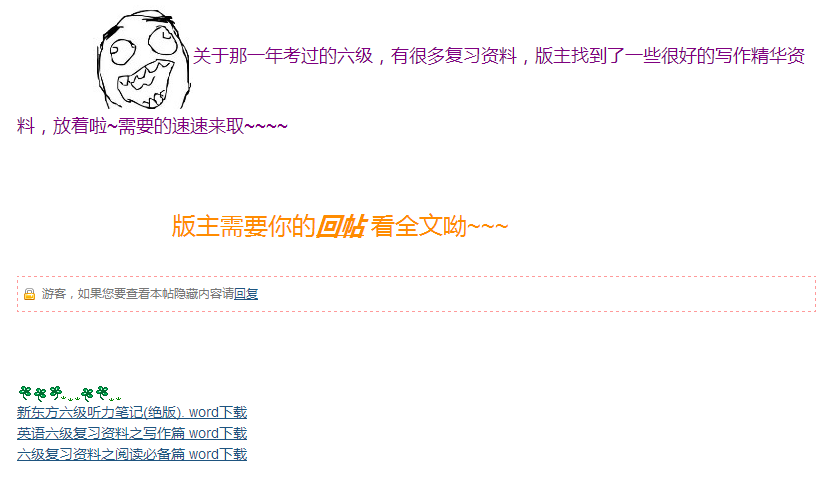 关于那一年考过的六级,有很多复习资料,版主找到了一些很好的写作精华资料,放着啦~需要的速速来取!