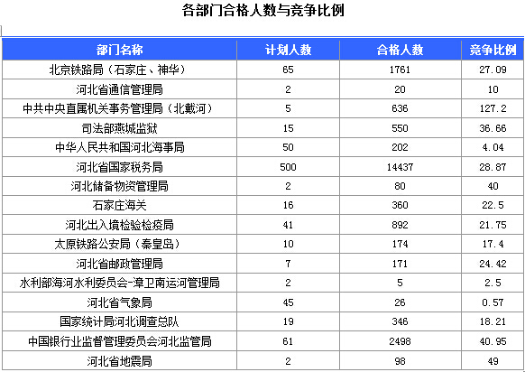 截止到21日17时,通过审核人数前三位的部门依次是:河北省国家税务局、北京铁路局(石家庄、神华)、中国银行监督委员会河北监管局,三部门共通过审核18696人,占通过审核总人数的84%。