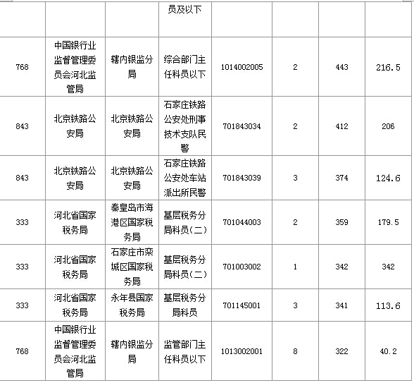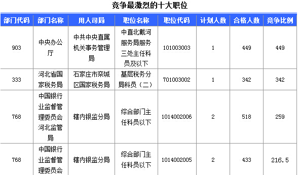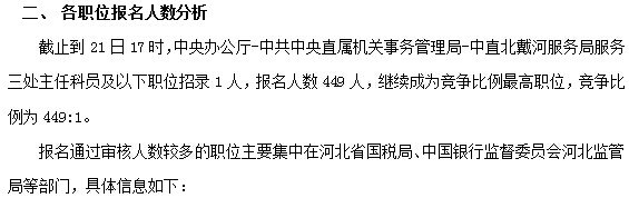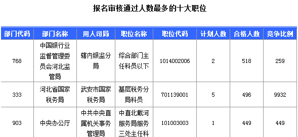 目前,报名人数最多的职位为“中国银行业监督管理委员会河北监管局-辖内银监分局-综合部门主任科员以下”,共通过审核518人。