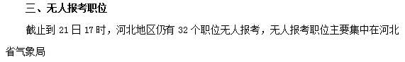 截止21日17时,国考职位中工作地在河北的职位共通过审核22256人,无人报考职位有32个,与昨日对比,报名人数增加5968,竞争最激烈的职位并未发生变化,仍然为中央办公厅中共中央直属机关事务管理局中直北戴河服务局服务三处主任科员及以下职位(代码101003003),竞争比为449:1。