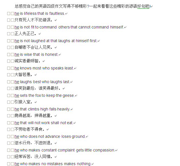 你是否总感觉自己的英语四级作文写得不够精彩?一起来看看这些精彩的谚语好句吧!快来下载哟!