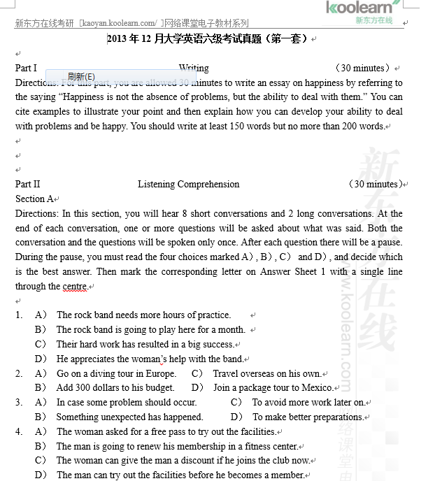 六级考试在即,你准备得怎么样了?现在新东方在线英语六级频道把2013年12月英语六级考试真题三套奉献给你,希望能给你有效的帮助!还等什么呢?快来下载吧!