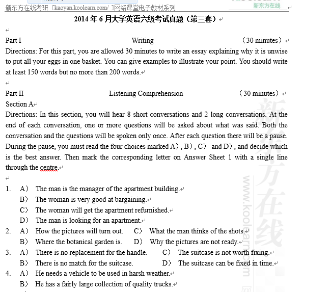 2014年6月英语六级考试真题三套 word下载