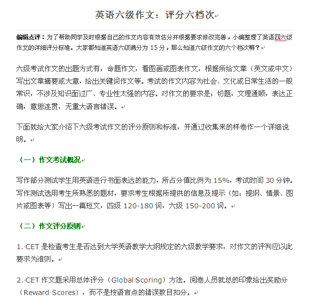 六级考试在即,你准备得怎么样了?现在新东方在线英语六级频道把大学英语六级作文评分六档次复习材料奉献给你,希望能给你有效的帮助!还等什么呢?快来下载吧!