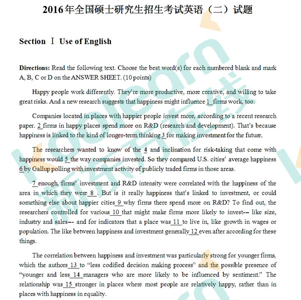 新东方在线考研频道考后第一时间发布2016考研英语二完型填空真题,新东方名师也将对真题答案进行深度解析,帮助大家估分、为后续复试调剂做好准备。更多2016年考研英语真题及答案、考研数学真题及答案、考研政治真题及答案、管理类联考、经济类联考真题及答案、考研专业课真题及答案,请关注【2016年考研真题及答案解析】专题!
