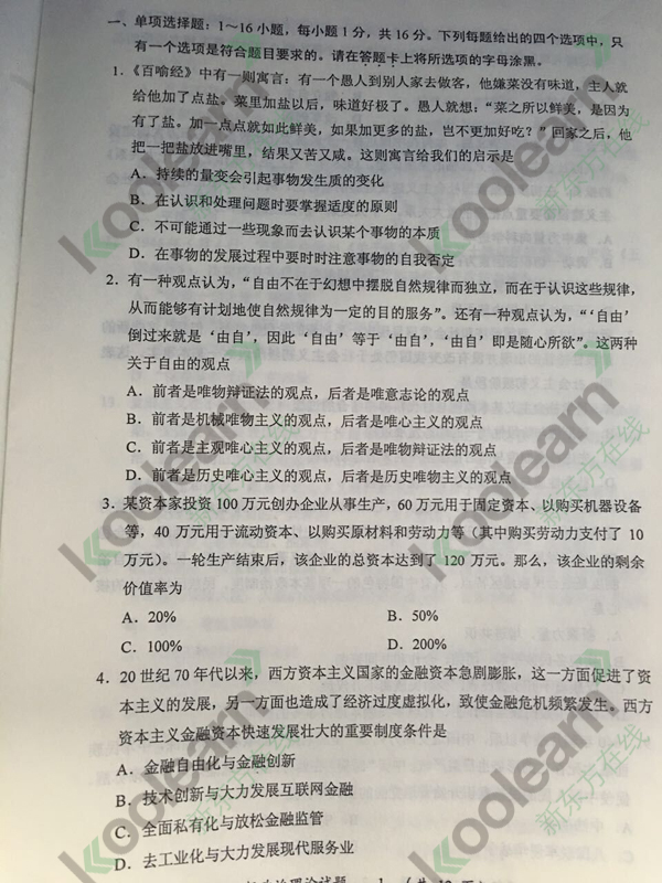 本文关键字: 2016考研政治单选题试题