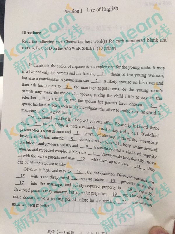 新东方在线考研频道考后第一时间发布2016考研英语完形填空真题(图片版),新东方名师也将对试题答案进行深度解析,帮助大家估分、为后续复试调剂做好准备。更多2016年考研英语试题及答案、考研数学试题及答案、考研政治试题及答案、管理类联考、经济类联考试题及答案、考研专业课试题及答案,请关注【2016年考研试题及答案解析】专题!