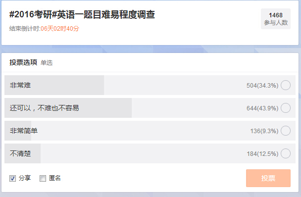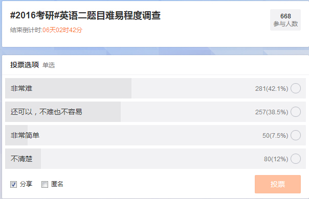 新东方在线讯 2016考研英语笔试于26日下午5时落下帷幕,考研英语作文题目及考研英语难易程度成为考后议论的焦点。据新东方在线推出的2016年考研英语难度调查,有42%的网友认为考研英语二“非常难”,百分之44的网友认为考研英语一难度适中。