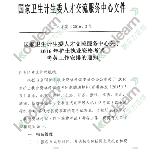 新东方在线医学网从某地方卫生局官方获悉,2016年护士资格考试报名入口将于1月12日开通,新东方在线医学网整理了相关通知,请考生参考。