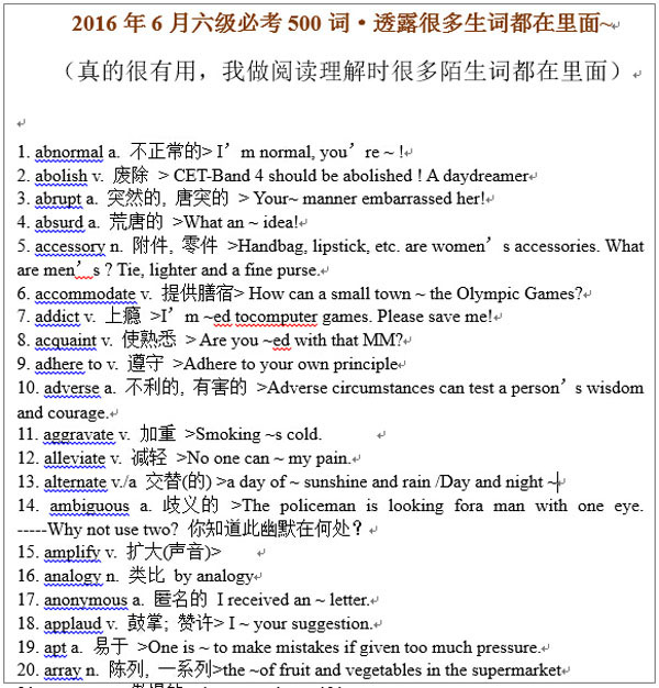 2016年6月英语六级必考500词 word下载