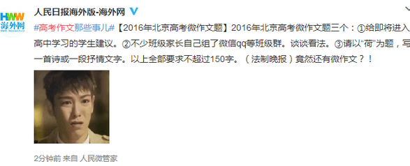 2016年北京高考微作文题有三个:①给即将进入高中学习的学生建议。②不少班级家长自己组了微信qq等班级群。谈谈看法。③请以“荷”为题,写一首诗或一段抒情文字。以上全部要求不超过150字。