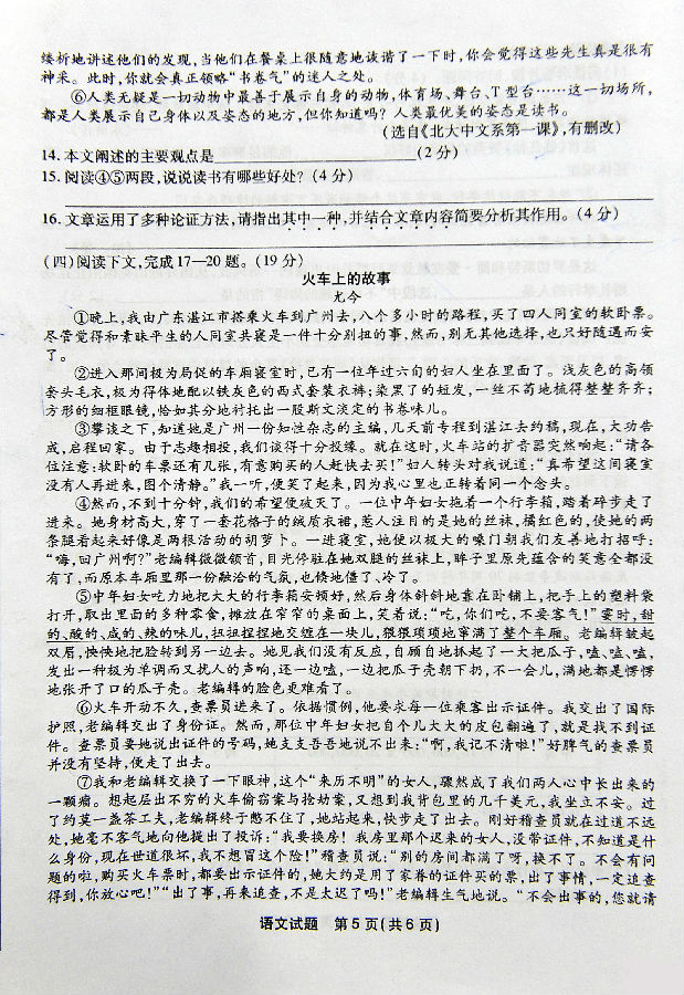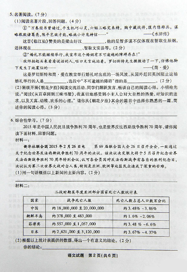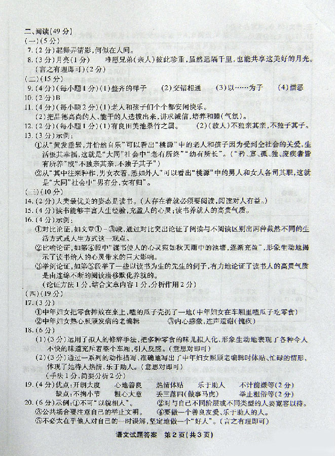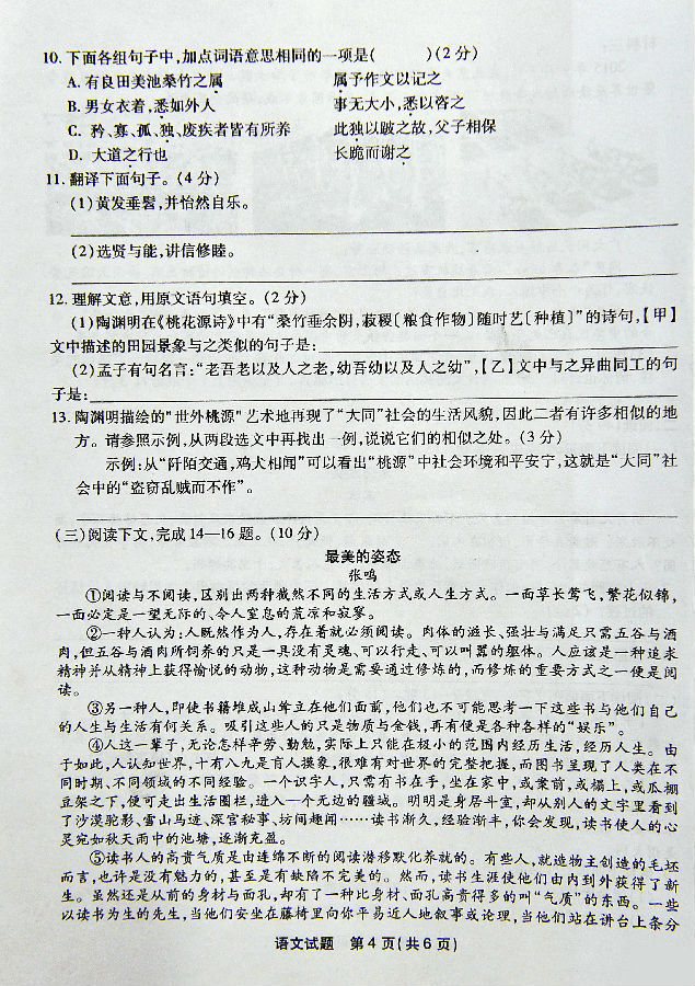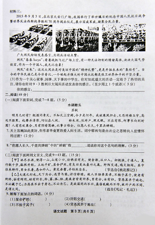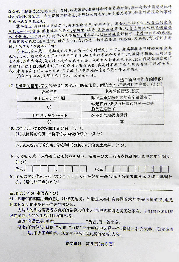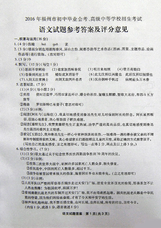 2016年福州中考语文试卷真题及答案