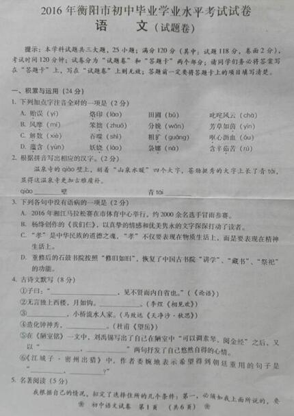 2016各地中考陆续举行,新东方在线中考网将第一时间整理中考试题,供中考生们参考。下面是《2016湖南衡阳中考语文试题及答案》,更多2016年湖南衡阳中考试题可查看2016中考试题及答案专题。