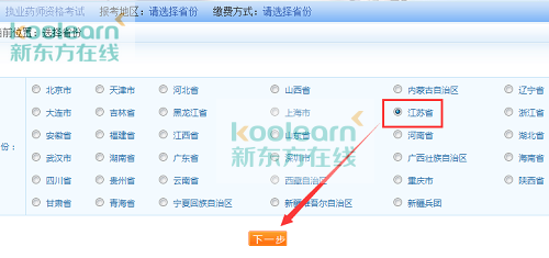 点击进入执业药师报名系统,选择执业药师考试→选择“江苏”,点击“下一步”,进行报名。
