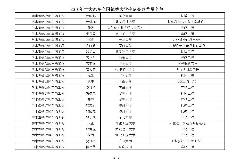 2016年吉大汽车全国优秀大学生夏令营营员名单