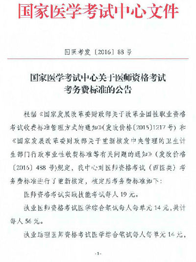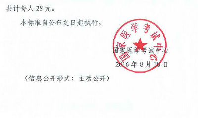 根据《国家发展改革委财政部关于改革全国性职业资格考试收费标准管理方式的通知》(发改价格[2015]1217号)和《国家发展改革委财政部关于重新核发中央管理的卫生计生部门行政事业性收费标准等有关问题的通知》(发改价格[2016]488号)规定,我中心对医师资格考试(西医类)考试费标准进行了重新核定,核定后考务费标准如下: