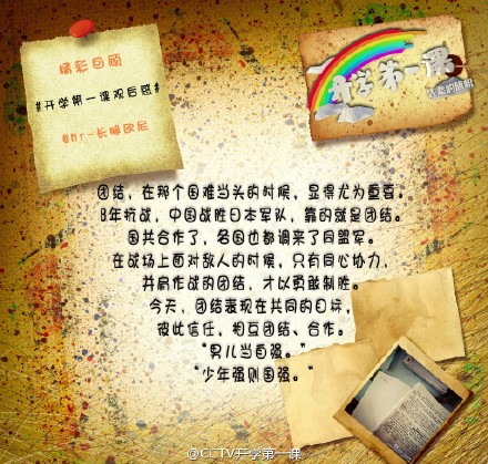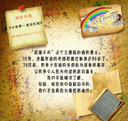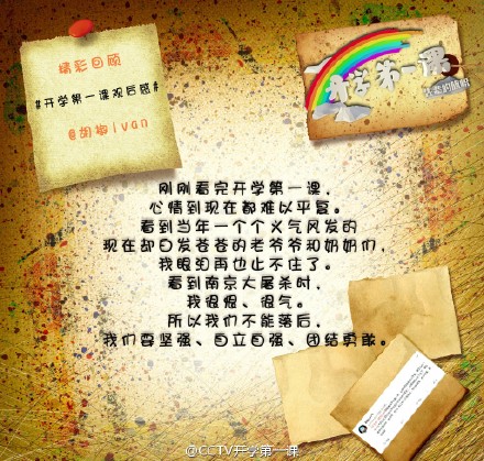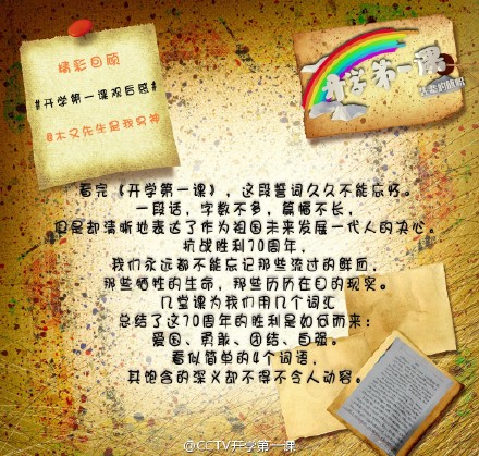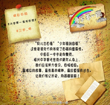 2016年开学第一课9月1日晚8点开课啦~同学们现在是不是正在奋笔疾书写观后感呢CCTV开学第一课官方整理了些往年开学第一课观后感的精彩回顾~温故而知新,同学们学习一下吧。