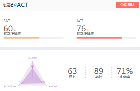 本测试系统由新东方在线研发,SAT-ACT Start-Up 测试,是由新东方集团 SAT 考试研究院研发,针对想去美国读本科的中国高中生的留学考试倾向性测试。测试结合改革后的 “新SAT” 和 ACT 考试内容,系统性地对考生的各项考试能力进行测评。测试能够快捷、准确地判断考生更适合参加 “新SAT” 考试还是 ACT 考试,帮助考生合理规划后续备考时间。