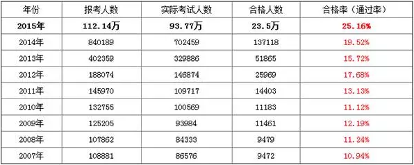 近9年执业药师通过率及考试人数汇总(2007-2015年)
