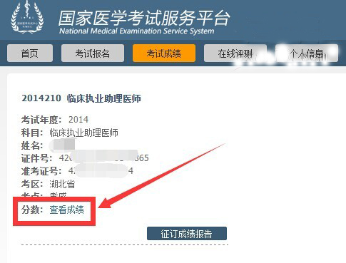 考生可登录国家医学考试网点击“成绩查询”,在国家医学考试服务平台登录界面填写正确的用户名、密码及验证码,成功登录后,进入“考试成绩”界面,点击分数右侧的“查看成绩”链接即可查询成绩。
