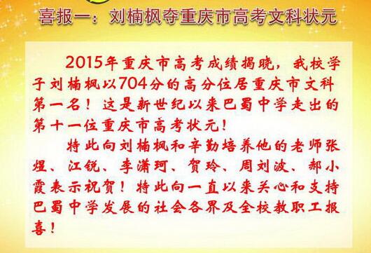 重庆巴蜀中学2014年共37名学生考入北大清华,其中鲁能校区考上清华北大共4名,七中文科共10人考入北大清华,14名学生保送进入北大清华。