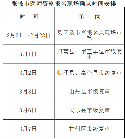 甘肃张掖2017年医师资格考试现场审核时间安排: