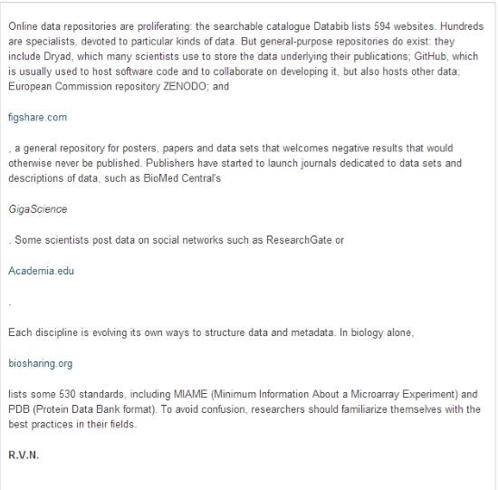 But the barriers are disappearing, in part because journals and funding agencies worldwide are encouraging scientists to make their data public. Last year, the Royal Society in London said in its report Science as an Open Enterprise that scientists need to “shift away from a research culture where data is viewed as a private preserve”. Funding agencies note that data paid for with public money should be public information, and the scientific community is recognizing that data can now be shared digitally in ways that were not possible before. To match the growing demand, services are springing up to make it easier to publish research products online and enable other researchers to discover and cite them. There are so many, in fact, that choosing where and how to publish data sets and other supplementary material can be confusing (see'Abundant options').