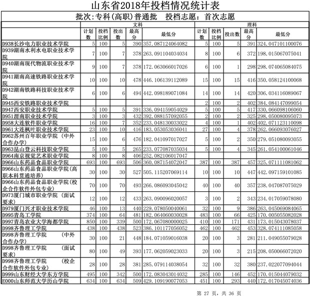 2018山东高考专科(高职)普通批投档分数线(文理类)