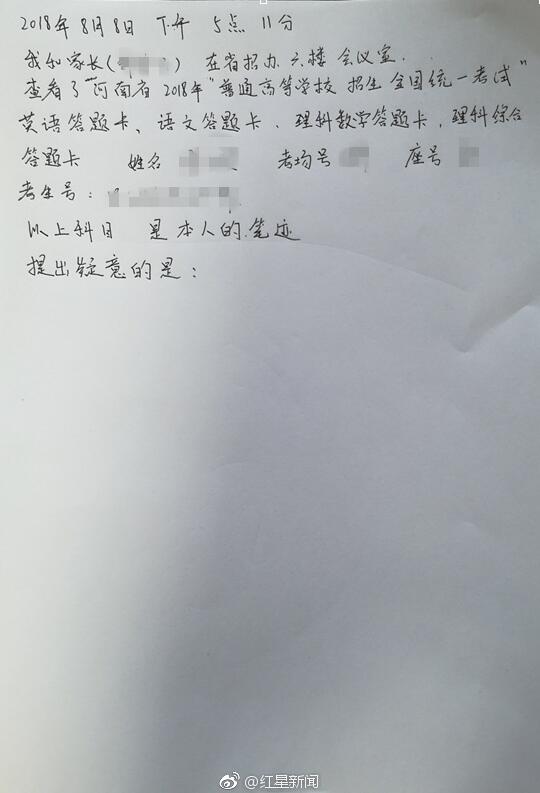 8月8日,信阳考生李闻天和商丘考生小淇(均为化名)来到河南省招生办公室查看自己的答题卡,以检验答案是否为自己所写。下午6点30后,李闻天和母亲从招生办公室走出,李闻天自己看了高考语文,数学,英语和理科综合答题卡,并确认是自己的笔迹,没有调包。他告诉红星新闻,已经确认放弃笔迹鉴定,并和母亲写了情况说明。