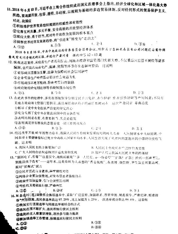 2019百校联盟TOP20十一月高三联考政治试题及答案(全国1卷)