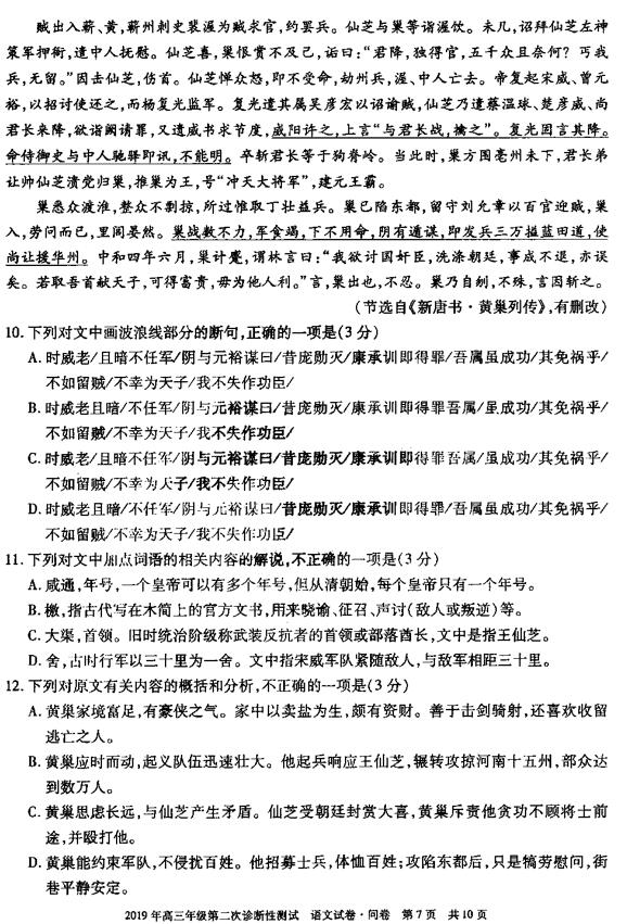 2019新疆乌鲁木齐二诊语文试题及参考答案